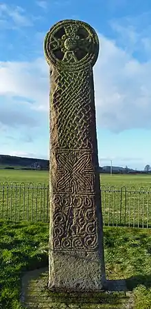 The large-scale occupation of Wales by England in the Medieval period is reflected in the archaeological record, particularly in the political architecture of castles. Wales has over 600 castles, many in stone built by the English during or following the Norman conquest.[23] It is consequently known to many as the castle capital of the world.[24][23][25] During that period the various Kingdoms of Wales and later the Principality of Wales formed,[26] both leaving significant archaeological remains.[27] There were also Vikings raids in Wales throughout the Medieval period, particularly in coastal areas.[28] Archaeological evidence also establishes non-violent interaction between the Norse and Welsh peoples, such as the Viking settlement at Llanbedrgoch.[28] A Viking sword guard was found underwater in Smalls Reef, Pembrokeshire Coast which dates to 1100-1125 CE.[29] This guard is archaeological evidence of Viking influence and presence on the Pembrokeshire coast.[30] Artefacts from the medieval period also show evidence of Celtic Christianity. Augustine become the bishop of Canterbury in 590 AD, however, St Illtud was already spreading Christianity in Celtic Wales, perhaps very soon after Roman departure in 383 AD.[31] Celtic Christian stone crosses are now held within the 13th century Galilee chapel at St Illtud's church in Llanilltud Fawr (Llantwit Major) and are thought to date from the 8th to 10th centuries.[32] Perhaps the most famous Celtic cross in Wales and the tallest wheel cross in Britain is the Maen Achwyfan (Stone of (Saint) Cwyfan) which most likely dates from the 10th century. This monument contains Celtic- and Norse-influenced carvings of an armed warrior and is considered nationally important in the story of Christianity in Wales.[33][34][35]