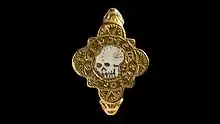 A gold ring with the image of a skull was discovered in Carreghofa, Powys in 2019. According to the National Museum of Wales, this ring is a memento more and is a reminder of the inevitability of death and also signifies the high mortality rates during this period (dated 1550-1650) compared to the modern-day.[36]