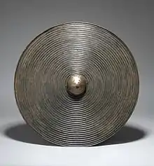 The Rhyd y Gors shield is large beaten copper alloy shield 67 cm wide dating from the 12th to the 10th century BC, which is currently held in the British Museum. The shield has twenty concentric ribs alternating with rows of bosses. The shield was discovered at Rhyd y Gors, Ceredigion and was donated to the British Museum by Sir Augustus Wollaston Frank in 1873. This shield is an example of early Bronze Age copper alloy use.[12]