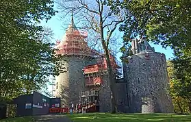 Around Wales, a variety of museums, organisations and charities help promote archaeology to the public. This includes access to many sites, monuments and museums, such as the 121 sites Cadw manages.[67] Public engagement is also encouraged by re-enactment and living history demonstrations and museums, such as Castell Henllys, a reconstructed Iron Age hillfort, and the St Fagans Folklore Museum, which recreates various aspects of Welsh history, with the latter receiving 683,613 visitors in 2018/19.[68] Similar sites include Cosmeston Medieval Village, a 14th-century living history museum. Accessibility is also improved with free online heritage databases, such as Coeflin or Archwilio, run by the Royal Commission on the Ancient and Historical Monuments of Wales and the Welsh Archaeological Trusts respectively.