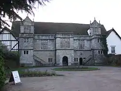 The E-shaped palace building is located on the east bank of the River Medway close to its meeting with the River Len. The two-storey central section is constructed of ashlar stonework with a main entrance through a central projecting porch in the north-east façade. Timber framed wings are at each side. The roof is clay tiled and two projecting stone-built dormer windows at attic level on the entrance façade are capped with finials. The south-west façade has windows in a variety of sizes, many stone-framed, and includes a large corbelled and three-tiered and oriel window.[2]