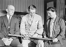 The exertion had left Jackson exhausted. His teammate "Stork" Hendry said that Jackson was limp when he returned to the dressing room. "We had to mop him with cold towels", he said.[26] Early the next day, Ryder was dismissed and Jackson was joined by Bradman. The two young batsmen shared a long partnership, with Jackson on 97 at the end of the session.[27] As they returned to the wicket after the interval, Bradman advised his younger colleague to play carefully to secure his century. Jackson made no reply, but responded by hitting the first ball from Larwood to the point boundary for four runs, the ball rebounding back on to the field in front of a cheering crowd in the Members' Stand.[28] After this, he cut loose, with deft glances from the faster balls and cut shots reminiscent of Charlie Macartney.[29] Jackson was eventually dismissed for 164, making him the youngest Australian batsman to score a Test century, a record beaten by Neil Harvey in 1948.[30] It is still the second highest score on Test début by an Australian, only one run fewer than Charles Bannerman's 165 not out in the first-ever Test in 1877.[31] This innings saw Jackson hailed as a national hero and he was showered with tributes including a public meeting called in his honour by the Mayor of Balmain.[32]