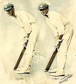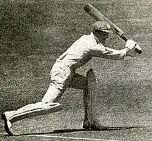 His contemporaries noted his classical style. The journalist A.R.B. Palmer described his cover drive as "... perfectly balanced and true ... the bat seems a whip in his hands."[67] Clem Hill, the former Australian captain, noted Jackson's sparkling footwork, watching close enough to notice that his toes turned in as he walked.[14] Like Kippax, whose style was uncannily similar, Jackson wore his shirt-sleeves almost down to his wrists. This was not in imitation but to conceal the blemishes on his arms caused by psoriasis. Kippax was not seen by some as the best person to imitate, with Charles Kelleway critical of Jackson's flourishes, wishing he would not be so, "... cramped in copying other batsman's styles".[68]