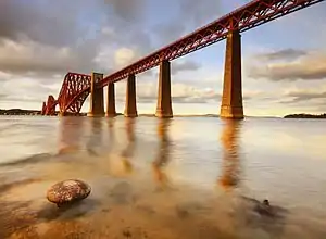 The most important engineering project was the Forth Bridge, a cantilever railway bridge over the Firth of Forth in the east of Scotland, 9 miles (14 km) west of central Edinburgh. Construction of a suspension bridge designed by Thomas Bouch (1822–80), was stopped after the collapse of another of his works, the Tay Bridge.[46] The project was taken over by John Fowler (1817–98) and Benjamin Baker (1840–1907), who designed a structure that was built by Glasgow-based company Sir William Arrol & Co. from 1883. It was opened on 4 March 1890, and spans a total length of 8,296 feet (2,529 m). It was the first major structure in Britain to be constructed of steel;[47] its contemporary, the Eiffel Tower was built of wrought iron.[48]