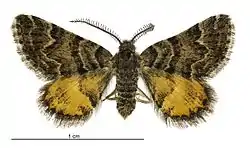 ♂,♀. Primaries above whitish, clouded and banded with brown ; the principal markings are an angulated transverse subbasal dark brown band ; two central bands forming a band, its inner edge subangulated, its outer edge very irregular, projecting within the median interspaces; an interrupted submarginal brown streak; a brown apical spot, and five oval marginal red spots enclosing black dots at their interior extremities ; fringe alternately brown and white ; secondaries ochre-yellow, with a central angulated bifid band, an angulated submarginal streak, and the outer border composed of dark grey scales ; a marginal series of black dots ; fringe grey ; body brown ; abdomen banded with white : primaries below stramineous ; an angulated postmedian band, bifid above the median nervure, a dot at end of cell, an irregular transverse tapering subapical streak, and the centre of the outer border black-brown ; a subapical spot, and the apical border pale ferruginous ; a spot on the costa, and an irregular apical submarginal streak, white ; fringe alternately brown and white ; secondaries brick-red ; a central longitudinal cuneiform streak proceeding from the base to near the outer margin, and the abdominal border, white ; a spot close to the base, a central angulated transverse band, a claviform submarginal streak, and a spot on the outer margin, black ; fringe grey ; body below whitish. Expanse of wings 8+1⁄2 lines.[4]