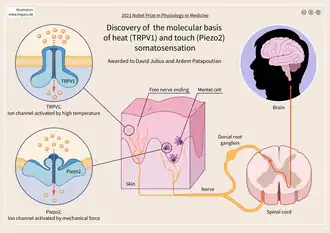 Patapoutian also made significant contributions to the identification of novel ion channels and receptors that are activated by temperature, mechanical forces or increased cell volume.[23][24] Patapoutian and co-workers were able to show that these ion channels play an outstanding role in the sensation of temperature, in the sensation of touch, in proprioception,[25] in the sensation of pain and in the regulation of vascular tone. More recent work uses functional genomics techniques to identify and characterize mechanosensitive ion channels (mechanotransduction).[13][26][27][28]