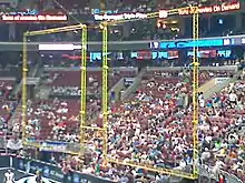 The Chicago Bears of the National Football League hosted an experimental game against their crosstown rivals, the Cardinals, after the 1930 NFL season, at the indoor Chicago Stadium.[9] Two years later, poor weather conditions led to the Bears hosting the 1932 NFL Playoff Game against the Portsmouth Spartans (now the Detroit Lions) at the stadium.[10][11][9][12][13][14] A dirt and tanbark field measuring 80 yards long (60 yards plus two ten-yard end zones) and 45 yards wide was constructed on the arena's floor. The Chicago Stadium games were notable for introducing several rule changes, including the introduction of hash marks to keep play away from spectators who were seated next to the field (much like modern indoor football), while goal posts were moved to the goal line. To compensate for the smaller field, teams were "penalized" 20 yards upon crossing midfield. (The Bears' official Web site goes further and claims that field goals were outlawed for the 1932 game.)[15]