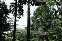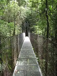 The Arenal Hanging Bridges (Mistico Park) are a series of suspension bridges in the Volcan Arenal National Park area, offering views of Lake Arenal and Volcan Arenal. The bridges form part of a 2-mile (3 kilometre) self-guided interpretive trail through a private rainforest reserve.[1] Místico Arenal Hanging Bridges Park is located on the Arenal fault in a tropical transition wet forest. It is located at 600 m. above sea level, and it concentrates 250 ha of mature forest, with an annual rainfall of 3.500-6.000 m.m. and a relative humidity of 88-92%. The trail is 3 km and allows tourists to walk on 15 bridges; 6 of which are hanging. This is a highly diverse forest since it lies between the boundary of highland and lowland forest, integrating species from both areas.