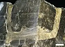 Arenicolites in vertical plane. The rock is cut with a rock saw with two oblique cuts. Scale bar = 1 cm.