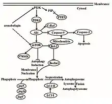 Besides its effects on the Na+-K+ pump, arenobufagin also has some other effects on cells, which were discovered in experiment with cancer cell lines. It causes apoptosis by tempering with mitochondria. In cells treated with it, a decreasing mitochondrial potential was detected (in a dose-dependent manner), as well as a high Bax/Bcl-2 ratio, which is associated with apoptosis, or programmed cell death. Bax translocation from cytosol to mitochondria was also found to be increased. In addition to these effects, arenobufagin also induces morphological changes in organelles, blebbing of plasma membrane, shrinkage of nuclear membrane and chromatin condensation. These observation also indicate the occurrence of apoptosis. Last but not least, specific cleavage of poly (ADP-ribose) polymerase (PARP) and a decrease in pro-caspase9 and 3 were also induced by arenobufagin treatment. PARP is mainly involved in cell repair and programmed cell death. After treatment with arenobufagin, some cells make more autophagosomes and lysosomes, whereas other cells undergo apoptosis. Arenobufagin also leads to increased expression of LC3-II, Biclin1(initial vesicle formation), Atg5 (elongation and completion), Atg9, Atg16L1 and p62/SQSTM1, all proteins which induce autophagy. Blockers of autophagy increase the cytotoxic effect of arenobufagin. Addition of 3-MA increases the proportion of cells in which there in enlarged PARP cleavage and limited caspase-9 and caspase-3 cleavage. This indicates that autophagy pathways protect the cell against apoptosis by arenobufagin. It was hypothesized that arenobufagin may inhibit the PI3K/Akt pathway in controlling cell death and differentiation in response to external stimuli. It was found that arenobufagin inhibited the proteins Akt, PDK1 and PI3K, whereas it stimulated the PHEN-protein. It does this by altering the degree of phosphorylation. All these proteins are involved in the PI3/Akt pathway. Further down the pathway, arenobufagin indirectly inhibits the mTOR-protein, which is involved in apoptosis as well as in autophagy.[8]
