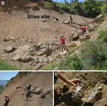The Elias site, located west of Arén, is on the west end of the Tremp Syncline. Geographically, the site is located in Unit 2 of the Tremp Formation, and equivalent of the Conques Formation. In the same section of the Tremp Formation, but lower down, are the Blasi sites 1-3. The dinosaurs Arenysaurus and Blasisaurus are both from Blasi 1-3. The Tremp Formation is made up of 900 m (3,000 ft) of reddish rock in the South Pyrenean central Unit. Lower in the formation is a mix of platform marine deposits, that are late Campanian to Maastrichtian in age. Blasi 1 is located in the upper Arén Formation, with Blasi 3 extending into the upper Tremp Formation.[1]