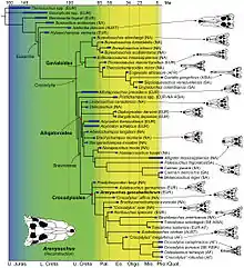 In Puértolas, Canudo & Cruzado-Caballero's phylogenetic analysis, Arenysuchus was found to be one of the most basal members of Crocodyloidea, the superfamily of crocodilians that includes crocodiles and their extinct relatives. Other basal crocodyloids include Prodiplocynodon and "Crocodylus" affinis from North America and Asiatosuchus from Europe. Of these genera, only Arenysuchus and Prodiplocynodon are known from the Late Cretaceous, making them the earliest known crocodyloids. Below is a cladogram after Puértolas, Canudo & Cruzado-Caballero, 2011:[1]