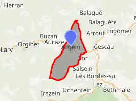 Argein is located some 12 km south-west of Saint-Girons just a kilometre west of Audressein. Access to the commune is by the D618 road from Audressein in the east passing through the centre of the commune and the village and continuing west to Aucazein. Apart from the village there is also the hamlet of Viellot. The centre of the commune is the valley of the Bouigane oriented east–west where the village lies. In the valley there is some farmland however the rugged north and south of the commune is heavily forested.[4]