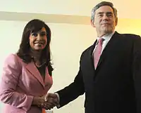 Since the mid-2000s, diplomatic relations between the UK and Argentina have become increasingly strained. In 2006, Argentina renewed claims to the Falkland Islands, citing concern over fishing and petroleum rights.[19] On 28 March 2009, UK Prime Minister Gordon Brown stated that there was "nothing to discuss" with Cristina Kirchner, the Argentine president, over sovereignty of the islands, when they met in Chile on his pre-2009 G-20 London Summit world tour.[20] On 22 April 2009 Argentina made a formal claim to the UN to an area of the continental shelf encompassing the Falklands, South Georgia and South Sandwich Islands, and parts of Antarctica, citing 11 years worth of maritime survey data.[21] The UK quickly protested against these claims.[22]