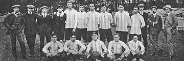 The kit first worn by Argentina in their official debut v Uruguay in 1902 was a light blue shirt.[30][31] On July 2, 1908, Argentina debuted the light blue vertical stripe on white jersey, when the squad played vs a team formed by Liga Paulista players at Velódromo Paulistano.[32] That striped jersey has remained as the official kit since then. The away kits usually have been in dark blue shades, varying the colors of shorts and socks.