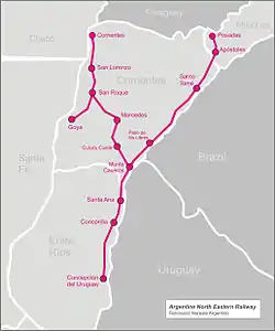 The Argentine North Eastern Railway (ANER) (in Spanish: Ferrocarril Nordeste Argentino, also Ferrocarril del Nord-Este Argentino) was a British-owned railway company, founded in 1887, that operated a 1,435 mm (4 ft 8+1⁄2 in) standard gauge railway network in the provinces of Entre Ríos, Corrientes and Misiones in Argentina. When the company was nationalised in 1948 it became part of the state-owned General Urquiza Railway.