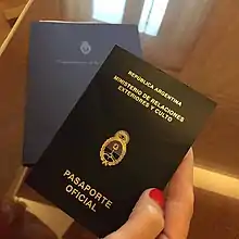![]() The front cover of the current biometric Argentine passport, featuring its Mercosur blue cover. | |