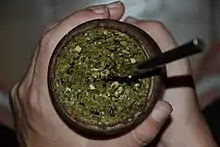 Mate is a tisane, or herbal tea, that is popular in Argentina as well as in Brazil, Paraguay and Uruguay. Mate is the Quechuan word for "gourd".[8] Mate is served in a hollow gourd (or occasionally a horn or a hoof),[9] and drunk through a metal straw called a bombilla. This serving style originated with a native culture, the Guarani. The Guarani called the yerba mate plant Caa'.[10] Indigenous peoples made bombilla straws from hollow cane, and made a filter at the end with vegetable fibers; today's bombilla straws, although made of metal, retain the filter feature at the end that is submerged in the gourd.[8]