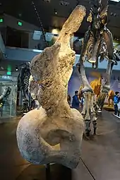 Separating fossils from the very hard rock in which the bones were encased required the use of pneumatic hammers.[2][3][4]: 35 The additional material recovered included seven dorsal vertebrae (vertebrae of the back),[1] the underside of the sacrum (fused vertebrae between the dorsal and tail vertebrae) including the first to fifth sacral vertebrae and some sacral ribs, and a part of a dorsal rib (rib from the flank).[2] These finds were also incorporated into the collection of the Museo Carmen Funes.[2]