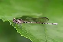 This genus of damselflies are known as dancers because of the distinctive jerky form of flight they use which contrasts with the straightforward direct flight of bluets, forktails and other pond damselflies. They are usually to be seen in the open where they catch flying insects on the wing rather than flying about among vegetation picking off sedentary prey items. They tend to land and perch flat on the ground, logs and rocks.[2] When perched, they usually hold their wing slightly raised above the abdomen.[3]