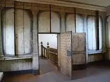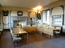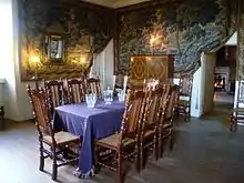 The north wing contained the kitchen on its ground floor, the eastern half being the original building with its early kitchen. The first floor contained the private rooms. The main entrance which is in the central east wing led directly into the Laigh Hall (ground-floor cellar). The first floor of the east wing contained the High Dining Room for entertaining guests and, on the south side, the more private Drawing Room. The ground floor of the south wing contained rooms for the head of the household and the eldest son. The southeastern corner of this wing housed the Lower Dining Room. The first floor of the south wing housed the bedrooms of the Lord and Lady of the house (My Lord and Lady's Bed Chamber) and My Lady's Closet, the private salon of the lady of the house.[2]