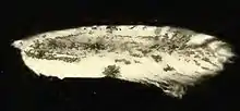 The wingspan is about 13 mm. The costal part of the forewing above the fold is dark brown, with a series of even darker costal spots from the middle to the apex, the outer ones intersected with white dashes. The dorsal part of the wing below and somewhat beyond the folds is ochreous white, with a semicircular, not very well defined dark brown spot on the middle of the dorsal edge and a smaller one at the apical third. The hindwings are dark fuscous.[3]