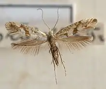 The wingspan is 11–13 mm (0.43–0.51 in).The head and thorax are whitish. Forewings are shining whitish, on costal half strigulated with light golden-brown ; a transverse dorsal mark at 1/3, an outwardly oblique streak from middle of dorsum, and an indistinct tornal mark golden-brown. Hindwings are grey.[2]