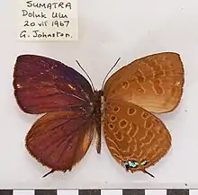 Arhopala delta is a species of butterfly belonging to the lycaenid family described by William Harry Evans in 1957.[2] It is found in Southeast Asia (Peninsular Malaya, Sumatra and Borneo).[3][4]