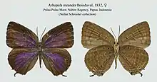 Arhopala meander , the bright oakblue, is a butterfly in the family Lycaenidae. It was described by Jean Baptiste Boisduval in 1832. It is found in the Australasian realm (Trobriand Island, Fergusson Island, Woodlar Island, New Guinea, Aru, Ambon, Waigeu, Louisiades, and Australia (Cape York)).[2]