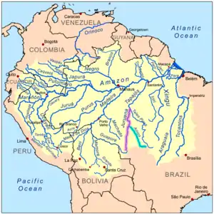 ![]() The Arinos (highlighted in turquoise) empties into the Juruena (pink) | |