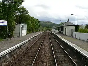 Arisaig railway station serves the village of Arisaig on the west coast of the Highland region of Scotland. This station is on the West Highland Line, 34 miles (55 km) west of Fort William on the way to Mallaig. The westernmost station on the Network Rail network, it is the only one of the four cardinal points of the national network that is not a terminus.