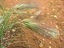 Aristida behriana is a native Australian species of grass commonly known as bunch wire grass or brush wire grass. It is a bright green perennial plant forming short, tufted tussocks up to 40 centimetres (16 in)[1] high. Its seeds have three long, radiating awns; it is a member of genus Aristida, grasses known commonly as three-awns. The species favours low fertility and well-drained soils. It is commonly found in mallee woodlands and plains, where it grows on sunny slopes. Superficially, the flower heads resemble those of the invasive weed African feather-grass (Pennisetum villosum).[2] A. behriana is found in all mainland Australian States.[3]
