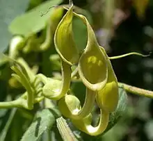 Green and purple tube shaped flowers bloom during July to August, coming out from the axils. Calyx tubes are glabrous and widen to the bottom, and narrowing towards the top they open widely like horns.[3] One side of the lobes lengthen with sharp edges, and the length of the peduncles are 1 centimetre (0.39 in) - 4 centimetres (1.6 in). The flowers do not have floral leaves and consist of 6 stamens and 6 pistils joined together as a whole. The ovaries are very thin, long and fragile.