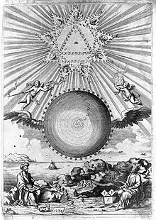The frontispiece depicts, at the top, the all-seeing Eye of Providence within a triangle representing the Holy Trinity. In each angle Hebrew letters spell out Jah, the name of God. Around this the nine orders of angels are arranged in three more overlapping triangles. Beneath this fly two putti, one carrying a ruler and a plumb line, while the other carries a tablet with the magic square of three. Within this square, numbers can be added by row, by column or diagonally, but always add up to fifteen.[7]
