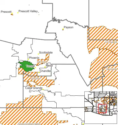 After the 1990 Census, the district was reconfigured to include the Hopi Reservation on the other side of the state. This was a product of longstanding disputes between the Hopi and Navajo. Since tribal boundary disputes are a federal matter, it was long believed inappropriate to include both tribes' reservations in the same congressional district.[4] However, the Hopi reservation is completely surrounded by the Navajo reservation. The final map saw the Hopi reservation connected to the rest of the district by a long, narrow tendril stretching through Coconino County. This was the only way to allow the district to remain contiguous without covering significant portions of Navajo land.