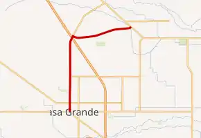 SR 387 is a 15.71-mile (25.28 km) highway that connects Casa Grande with I-10 and SR 87. The southern terminus of the highway is located at an intersection with SR 84 and SR 287 in Casa Grande. It heads north through the city from this intersection to the Gila River Indian Reservation before reaching I-10. After the interchange with I-10, the highway intersects SR 187, with SR 387 turning towards the east at the intersection. The highway continues to the east-northeast until it reaches its northern terminus at SR 87.[1][2]