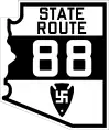 State Route 88 is a long state highway in the U.S. state of Arizona. It runs from U.S. Route 60 (US 60) in Apache Junction through desert terrain to SR 188 near Roosevelt Dam. Following the Salt River for much of its length, the section east of Tortilla Flat is known as the Apache Trail and is part of the National Forest Scenic Byway system. The Apache Trail was built in the mid-1920s and the number 88 was assigned in 1927. An eastern extension of State Route 88 to Globe, Arizona was redesignated as State Route 188 on August 20, 1999.
