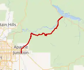 SR 88 begins at a diamond interchange with US 60, the Superstition Freeway, in southern Apache Junction. The route follows Idaho Road northward through a residential area with four lanes. Following a junction with Old West Highway, SR 88 turns northeast onto Apache Trail and narrows to two lanes. The route exits the city limits of Apache Junction, entering desert terrain. Passing a ghost town known as Goldfield, Apache Trail enters Tonto National Forest just northwest of Lost Dutchman State Park. SR 88 nears Canyon Lake south of the Mormon Flat Dam and follows a part of the southern shore of Canyon Lake. Apache Trail heads away from the Salt River. It passes through the town of Tortilla Flat, becoming an unpaved dirt trail winding eastward through the Superstition Mountains. SR 88 again turns northeast and nears Apache Lake. The route follows the Salt River northeast to the Theodore Roosevelt Dam, near which the route is again paved. SR 88 intersects with SR 188 along the coast of Theodore Roosevelt Lake.[2]
