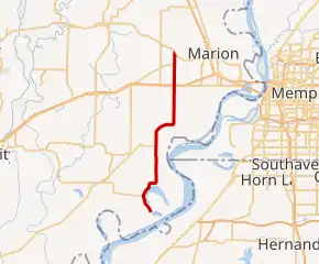 Highway 147 begins near Horseshoe Lake, Arkansas at the southern terminus of Highway 131. The route runs north to serve as the eastern terminus of Highway 38, with Highway 147 picking up the Great River Road designation northbound. Highway 147 has another junction with Highway 131 before curving due north along the Mississippi River. The highway serves as the eastern terminus for Highway 50 south of Anthonyville, Arkansas before meeting a different Highway 131 in Edmondson. Highway 147 has a junctions with US 70 and I-40/US 63/US 79, with the former being the southern frontage road for the latter. The road continues north to terminate at US 64 near the city limits of West Memphis.[2]