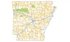 Highway 151 begins at Highway 18 (Main Street) in Blytheville and runs north to Gosnell and Arkansas International Airport.[4] The route intersects and forms a concurrency with Highway 181 northwest for 2.04 miles (3.28 km), with Highway 151 splitting north to terminate at Missouri supplemental route TT at the Missouri state line.