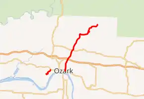 Arkansas Highway 219 (AR 219, Hwy. 219) is a designation for two state highways in Franklin County, Arkansas. The southern segment of 1.50 miles (2.41 km) runs from Youth with a Mission Ozarks northeast to Ozark.[2] A northern segment of 10.88 miles (17.51 km) runs from U.S. Route 64 (US 64) through Ozark northeast to the Missouri state line.[3]