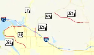 Highway 326 (AR 326, Ark. 326, and Hwy. 326) is a designation for two state highways in Pope County. One route of 9.96 miles (16.03 km) in Russellville begins at Highway 7 and Highway 7 Truck and runs northeast to Highway 7. A second route of 6.52 miles (10.49 km) begins at Highway 124 and runs east to Highway 105. All routes are maintained by the Arkansas State Highway and Transportation Department (AHTD).