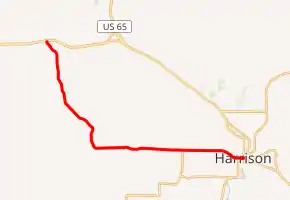 AR 392 begins at an intersection with US 62 and US 412 at Little Arkansaw, 3.2 miles (5.1 km) east of Alpena. From here the route heads south, leaving Little Arkansaw and heading through a rural area. The highway turns southeast to pass through Batavia; past the community, it briefly heads south before turning eastward. After passing through Capps, the road crosses the Dry Jordan Creek before meeting northbound AR 397. The two highways are briefly concurrent before AR 397 turns south; AR 392 continues eastward toward Harrison as Capps Road. In Harrison, the route enters a residential area before curving southeast toward Stephenson Avenue. It follows Stephenson Avenue east for two blocks before turning south into a business district on Pine Street. After following Pine Street for a block, the route terminates at AR 7.[4][5]