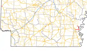 Highway 4 (AR 4, Ark. 4, and Hwy. 4) is a designation for two state highways in Arkansas. The western segment of 2.99 miles (4.81 km) runs from SH-4 at the Oklahoma state line and terminates in Cove.[2] An eastern segment of 22.49 miles (36.19 km) begins at U.S. Route 278 (US 278) in McGehee and heads east to Arkansas City then north to Highway 1 before terminating.[3] The two routes were formerly connected until a portion of approximately 230 miles (370 km) was redesignated US 278 in 1998. The eastern segment is part of the Great River Road.