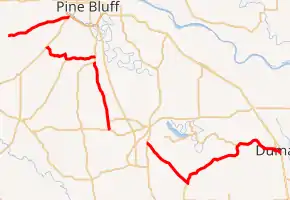 Highway 54 (AR 54, Ark. 54, and Hwy. 54) is a designation for two state highways in Southeast Arkansas. One route of 28.80 miles (46.35 km) begins at US 65/US 165 in Dumas and runs west to US 425/Highway 11.[lower-alpha 1] A second route of 52.65 miles (84.73 km) begins at Highway 114 and runs west to County Road 18 at the Grant/Jefferson county line. Both routes are maintained by the Arkansas Department of Transportation (ARDOT).[3]
