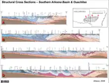This is present in the southern part of the basin as a result of compressional tectonics and north directed thrusting.[5] Within the Arkoma Basin, broad synclines separated by narrow anticlines dominate the basin at surface. Listric thrust faults are known to underlie much of the folded section and ramp to the surface along the crests of many anticlines.[4] These compressional features are a direct result of the Ouachita uplift.