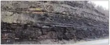 Pre-Cambrian granite serves as the basement rock for the Arkoma strata. The ocean basin that was present during the lower Paleozoic is indicated by deep marine shales with subordinate volumes of limestone and quartzose sandstones and bedded chert lie on top of the basement rock. These sequences are referred to collectively as the 'Ouachita Facies'[4] The Mississippian to early Atokan strata indicate a shallow marine environment. Middle Atokan consist primarily of deep-water clastic strata, and are restricted to the southern part of the basin south of its hinge line and to the tectonic belt; the Red Oak sandstone is the best-studied of these reservoirs. The youngest group (Desmoinesian and upper Atokan) consists mostly of fluvial-deltaic sediments (e.g., Hartshorne Formation), some of which show significant tidal influence (e.g., Booch sandstones).[5][6] Post Atokan strata are shales sandstones and coal beds deposited during final phases of foreland basin sedimentation These strata thicken to the south but do not display abrupt thickening across normal faults indicating that synde[7] positional faulting had ceased.