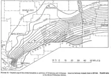 The Arkoma Basin is a peripheral foreland basin that extends from central west Arkansas to south eastern Oklahoma. The basin lies in between the Ozark Uplift and Oklahoma Platform to the north and Ouachita Mountains to the south and with an area of approximately 33,800 mi2. Along the southern edge of the basin, the Choctaw Fault is the boundary that separates the mountains from the basin itself. This basin is one of seven that lie along the front of the Ouachita and Appalachian mountain systems.[1] This basin is Oklahoma's fourth largest in terms of natural gas production. Oil has been extracted locally, but not on a commercial scale. Coal was the first natural resource used commercially within the basin. Surface mapping of coal seams in the early part of the 20th century lead to the discovery of sub-surface features that indicated the presence of natural gas. Mansfield, Arkansas was the site of the first natural gas discovery in 1902.[2]