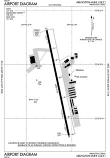 Arlington Municipal Airport (ICAO: KGKY, FAA LID: GKY) is five miles south of Arlington, in Tarrant County, Texas.[1] The airport is at the intersection of Interstate 20 and South Collins Road; it is a reliever airport for Dallas/Fort Worth International Airport and Dallas Love Field.