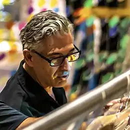 In 1990 Bayliss moved to the US to establish the glass program at Anderson University, where he was distinguished as a Professor Emeritus of Art in 2014.[5] Alongside academic duties, Bayliss has also kept a private professional practice allowing him to design and develop a series of sponsored public artwork, as well as to design studio glass art pieces and collections for renowned Venetian glass and decorative glassmakers.[6] Distinctions received by the artist include the 2017 Honor Award for Monumental Public Art (Indianapolis).[7]